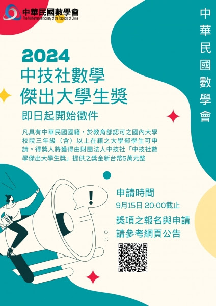 「中央研究院周鴻經獎學金」受理申請自即日起至114年10月18日止。數學系三年級以上或碩士班學生數學成績優異者均可申請。請檢附下列申請資料於申請截止日前交至應數系辦公室。
