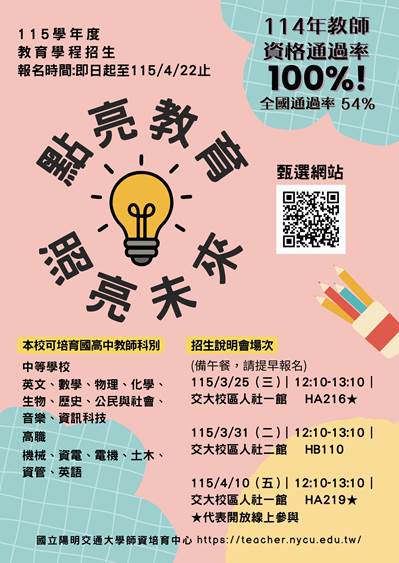想多一條人生選項嗎? 在陽明交大,不只可以當工程師、研究員,你也可以成為改變學生人生的老師。115學年度陽明交大教育學程開始招生! 在學期間取得資格,未來有機會成為 國高中 / 高職教師。只要你是 陽明交大在學生(大學/碩/博)對教學、分享知識有興趣 ,就可以報名甄選!報名時間:即日起至115年 4月22日(三)下午5:00前,採現場報名以及通訊報名。招生考試:115年5月8日(五)中午12:10~13:10簡章下載:請見本校師資培育中心網站-招生訊息:https://teacher.nycu.edu.tw/2026/03/02/115exam/修讀教育學程的好處多拿一張「教師證」未來職涯多一條路有機會申請 每月8000元師培獎學金, 教育實習補助 每月10000元。教育專業課程學分,可同時採計為本校大學畢業學分(依各系規定)。提醒:畢業後就不能修教育學程!現在不報名,可能就錯過唯一機會。一起把知識傳下去,也許你就是下一位影響學生一生的老師。如有異動,請以本校師資培育中心網頁公告為主。相關檔案:Poster_20260414.jpg