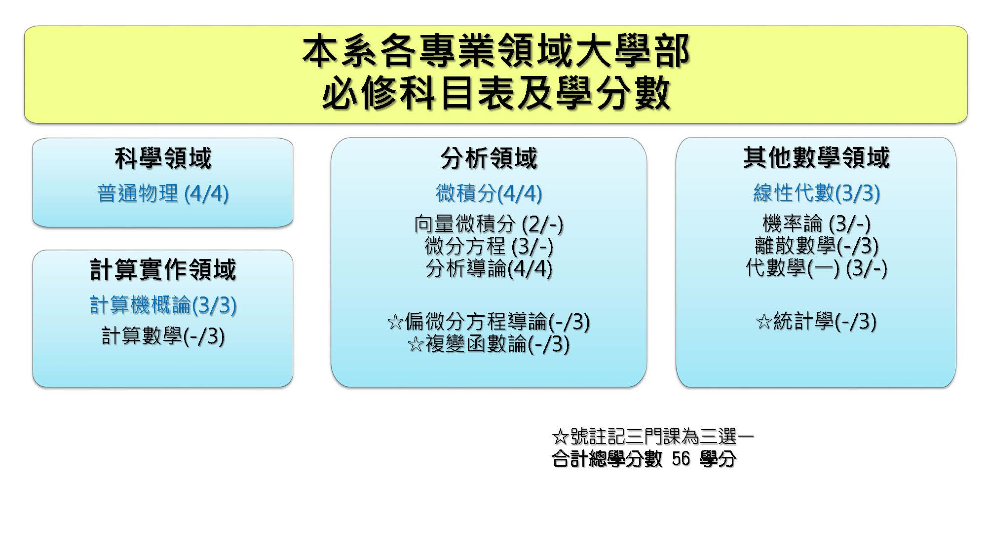 - 對想走「組合數學」、「資訊工程」 的同學修課順序可參閱【離散數學與最優化修課建議】。
